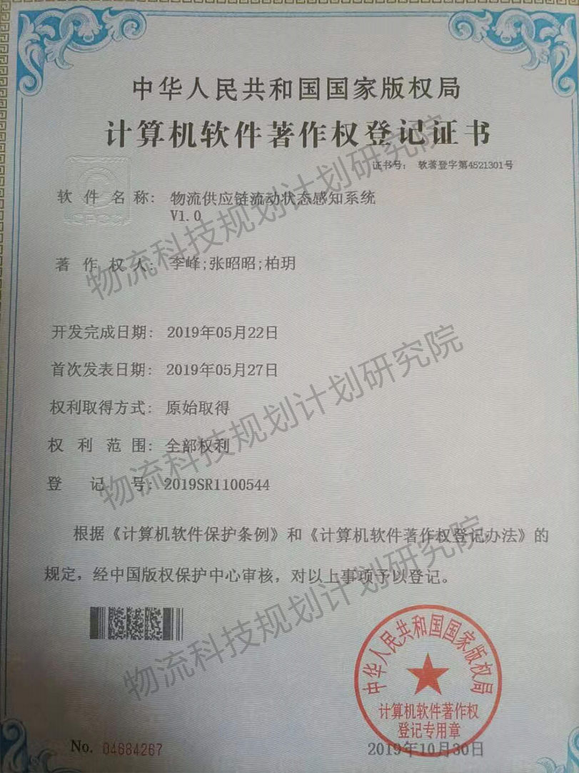 物流供應(yīng)鏈流動(dòng)狀態(tài)感知系統(tǒng)V1.0(證書(shū)號(hào):第4521301號(hào))
